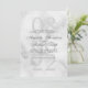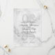 Elegante na moda design com noiva e nome do noivo no estilo de fonte do script elegante da cinza e detalhes no estilo de fonte do serif clássico da cinza com data grande na cinza clara como fundo no fundo do mármore branco.
