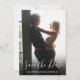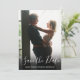 Este simples e moderno cartão de data de salvamento de foto com script apresenta sua foto especial sobreposta com uma data de salvamento de script acima de seus nomes, data e local em texto branco.