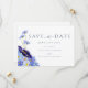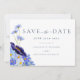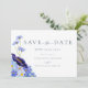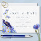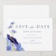 Cartão moderno de "save the date" para casamento de flores silvestres em aquarela para um casamento boêmio floral de verão. Arte única de flores silvestres pintadas à mão em aquarela e bela tipografia em script que é fácil de personalizar com os nomes da noiva e do noivo e a data do casamento. Flores únicas de prado, incluindo centáureas, papoulas, cosmos e não-me-esqueças com folhagem delicada pintada pela artista Catherine Sweetman em tons de azul centáurea, azul-beijo, azul-marinho, roxo e verde. Ideal para o jardim botânico ou para um casamento ao ar livre na primavera ou no verão em um prado de jardim. Encontre itens correspondentes na suíte de casamento moderna de flores silvestres azuis.