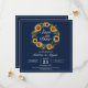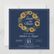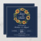 Convite de casamento elegante para salvar a data com uma bela coroa de girassóis e um fundo azul-marinho. Personalize-o com um código QR no verso que seus convidados podem escanear para abrir facilmente o site do seu casamento.