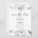 Um elegante design de flores preto e branco com lindas peônias, perfeito para um casamento chic e moderno. Totalmente personalizável: você pode facilmente mudar a cor do texto ou das flores para se adequar ao seu gosto.