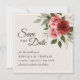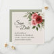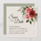 Casamento elegante Salve o cartão de data com rosas de cor d'água inspirados em vintage em vermelho e rosa, complementado com folhagem verde mutada em um fundo bege neutro. O verso do cartão exibe uma cor verde-salva clássica, que oferece uma aparência coesa e na moda. Todo texto é totalmente personalizável, fazer fácil de personalizar para seu dia especial e criar um romântico, uma manutenção de eterno.