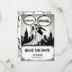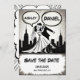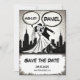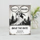 Este elegante casamento do estilo quadrinhos preto-e-branco, salvar o cartão de data é perfeito para um casamento moderno. O simples design apresenta uma caligrafia preta elegante e uma ilustração de noiva e noiva sobre um fundo temático de quadrinhos.