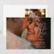 Este convite de casamento elegante em preto e branco com letra de rótulo pode ser personalizado com suas 2 fotos especiais e informações do dia do casamento. Criado por Thisisnotme©