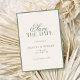 Crie seus próprios convites de casamento personalizados em estilo luxuoso old money. Adicione seus detalhes personalizados anunciando o dia do seu casamento em tipografia elegante e atemporal, com design nas cores verde sálvia e marfim.