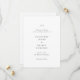 Convite de casamento elegante com design simples, incluindo seu monograma e detalhes do evento em fontes serifadas.
