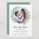 Rustic salve a data com seu dentro de foto favorito de uma aquarela pintada de verde, sobre um fundo branco. Abaixo estão as palavras "Salvar a Data" em uma letra de escrita manual e seus detalhes de casamento em uma fonte sans serif. A parte de trás é uma sombra correspondente de verde e pode ser alterada para qualquer cor desejada. Esta simples design botânica é excelente para uma celebração de verão. DESIGN TIP: Para obter melhores resultados, use uma foto com um fundo leve.