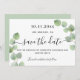 Um moderno e elegante Salve a Data para um casamento. Um branco decorado com caules verdes de eucalipto, sprigs. Personalize e adicione uma data e nomes. O texto: Salvar a Data é gravado com um script de estilo com letra de tendência grande. Fundo: fundo verde