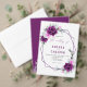 Este elegante cartão de salvamento combina encantos rústicos com elementos florais sofisticados. Um buquê exuberante de flores roxas e pinceladas agarra o topo, estabelecendo um tom romântico. A mensagem "Salvar a Data" é apresentada em um script a seguir, seguido da data, dos nomes dos casais e do local do casamento.