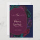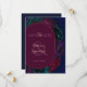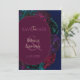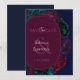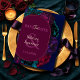 Um cartão romântico de 'save the date' floral em tons de joia, apresentando flores ricas em burgundy, ameixa escura e verde esmeralda sobre um fundo azul profundo. A paleta escura e sombria cria um tom gótico e romântico, enquanto a composição botânica moderna faz um anúncio ousado e elegante para sua celebração futura.