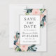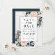 Um belo casamento floral salve o cartão de encontro num esquema popular de cor rosa e azul-da-meia-noite para dar o tom para uma encantadora celebração à frente. Buquês adoráveis de rosas de aquarelas e flores mistas em azul-rosa e da meia-noite com elementos verdes à deriva e esboços à volta do quadro central que incorpora o seu texto. O esquema de cores funciona bem para casamentos em qualquer estação do ano. Personalize o texto com seus nomes, data do casamento e cidade do local do casamento.