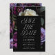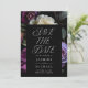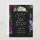 Casamento floral elegante salve as datas com um fundo de flores roxas, marfim e burgundy com uma folhagem verde e exuberante sobre fundo preto. "Salvar a data" é exibido em tipografia elegante e moderna. Personalize o floral roxo salve as datas com seus nomes, data do casamento e local. A design coordena-se com a nossa coleção de casamentos Moody Gothic Floral.