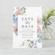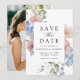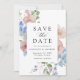 Faça seu anúncio de casamento inesquecível com este casamento elegante, salve o cartão de data. A frente apresenta uma delicada disposição floral de aquarela que enquadra as informações de data de salvamento, incluindo os nomes, a data de casamento e o local. Matizes macios de rosa empoeirado, rosa, azul, roxo, branco e verde criam um design romântico e eterno, perfeito para casamentos primavera e de verão. A parte traseira do cartão mostra uma foto de noivado vertical sangrando o cheio, adicionando um toque pessoal e sincero ao seu anúncio. Isto salve o cartão de data mescla elegantemente elegância e personalização, definindo o tom para sua próxima celebração.