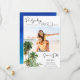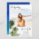 Foto do design da árvore de palmeiras de aquarelas salve as datas do seu casamento de destino de praia em Ocho Rios, Jamaica! Compartilhe sua foto de noivado favorita e seus próximos detalhes de casamento com a família e os amigos, com eles, salve as datas. A placa reverte para coordenar design de aquarela azul no verso. **Este convite pode ser personalizado para o seu local de casamento na praia! Contacte-me se tiver uma solicitação, alterarei o design apenas para si e enviarei um link de pedido sem custos adicionais. Entre em contato comigo através do botão abaixo. **