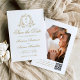 Compartilhe a entusiasmo da sua próxima celebração com este elegante casamento fotográfico, salve o cartão de data. O design apresenta uma crista floral dourada que rodeia as iniciais do monograma do casal, com "Save the Date" perfeitamente visível na coordenação da caligrafia dourada sobre fundo branco. Adicione seus nomes, data do casamento e local do casamento na frente. O verso destaca sua foto vertical do noivado com um código de QR digitalizável abaixo, guiando convidados para o seu site de casamento personalizado. Com espaço para instruções personalizadas e detalhes importantes, este cartão clássico e na moda é uma escolha eterno para casamentos modernos e elegantes.