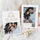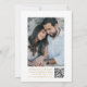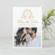Faça uma impressão duradoura com esta elegante foto dourada, salve o cartão de data. A frente apresenta suas iniciais personalizadas de monograma, moldadas por uma crista floral dourada em um fundo branco. Seus nomes são exibidos na sofisticada caligrafia dourada, seguida da data do casamento e do local. Uma foto horizontal de noivado por baixo adiciona um toque pessoal ao seu anúncio. A parte traseira do cartão destaca uma foto vertical do noivado junto com um código de QR digitalizável, permitindo que os convidados acessem facilmente seu site de casamento e detalhes personalizados. Uma escolha refinada e na moda para celebrações de casamento modernas, formais ou clássicas.