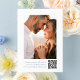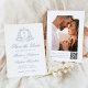 Anuncie seu dia especial em estilo com este casamento fotográfico, salve o cartão de data, com uma crista floral azul macia em volta das iniciais do monograma do casal. "Salvar a data" é escrito elegantemente em uma caligrafia azul correspondente em um fundo branco. Personalize a frente com seus nomes, data do casamento e local do casamento. O verso mostra sua foto de noivado vertical com um conveniente código QR abaixo, permitindo que os convidados digitalizem e acessem facilmente o seu site de casamento. Com espaço para instruções personalizadas e detalhes importantes, esta design é perfeita para casamentos eternos, românticos ou de inspiração costeira.