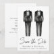 Anúncio de "Save the Date" para casamento gay com dois tuxedos em aquarela e uma apresentação elegante. Adicione os seus dados e personalize o verso.