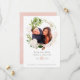 Convite de casamento trendy com folhagens em aquarela e flores cor de rosa e dourado rosé em uma moldura geométrica