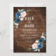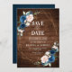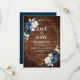 Cartão de aviso de casamento floral geométrico azul-marinho com buquê elegante de azul-marinho, azul-real, branco, rosa beijo e folhas de eucalipto verde-sage e moldura geométrica neutra brilhante em fundo de madeira rústica. Por favor, entre em contato comigo para qualquer ajuda na personalização ou se você precisar de qualquer outro produto com este design.