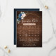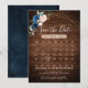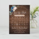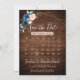 Calendário de casamento floral geométrico azul-marinho com cartão de 'save the date' apresentando um buquê elegante de azul-marinho, azul-real, branco, rosa e folhas de eucalipto verde-sage e moldura geométrica neutra com brilho em fundo de madeira rústica. Por favor, entre em contato comigo para qualquer ajuda na personalização ou se você precisar de qualquer outro produto com este design.