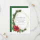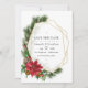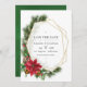 Convite de casamento de Natal rústico e moderno para salvar a data com moldura geométrica dourada e tipografia manuscrita apresentando sinos de trenó, flores de poinsettia, azevinho, visco e pinheiro.