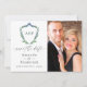 Cartões de aviso de casamento com monograma de crista folheada e tipografia de caligrafia elegante personalizável com as iniciais do casal.
