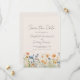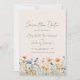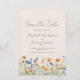 Este design boho rústico apresenta uma borda aquarela de flores silvestres laranja e azuis ao longo da parte inferior. As palavras "Salve a Data" e os nomes do casal aparecem em um script de caligrafia cinza carvão elegante, com o texto restante em fonte sans serif em um fundo bege.