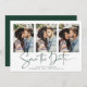 Moderno manuscrito Salve a data Cartão com fotos múltiplo em verde esmeralda e branco em uma fonte elegante e que evoca uma sensação romântica manuscrita. Projetado para usar três de suas fotos favoritas para personalização adicional. Adicione facilmente seus nomes e datas para um design verdadeiramente personalizado. Entre em contato conosco em cedarandstring@gmail.com se precisar de assistência com o design ou produtos correspondentes.