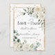 Belíssimas rosas brancas elegantes e minúsculas margaridas cercadas com uma estrutura rústica de ouro e um verde misto de eucalipto com outras folhas de aquarela convite para casamento. Um fundo branco limpo aumenta a elegância deste design adorável. Incrível. Ouro esmaecido em frente e atrás para criar uma aparência cônica.