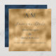 Lindos monogramas da noiva e do noivo no topo deste lindo cartão de Save the Date de casamento. Fundo falso dourado com fonte azul profunda para combinar com a parte de trás azul desgastada deste convite elegante. Absolutamente deslumbrante.