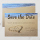 Para um casamento na praia. Tem as iniciais da noiva e do noivo escritas dentro de um coração na areia, na praia. Na borda superior vemos um oceano azul. O texto é marrom, como o coração de areia. O título "Salve a Data" é escrito em letra cursiva. A foto da praia com o coração de areia é de Petr Kratochvil da Public Domain Pictures e é gratuita para uso comercial.
