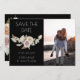 Esses cartões salve a data apresentam uma moderna e moderna design botânica com cor d'água, cor-de-rosa poeirenta, pêssego e rosas beges e folhas com folhagem em fundo preto. Personalize-os com o seu próprio texto e fotografia. Produtos correspondentes disponíveis.