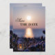 Um casamento no inverno romântico Salve a Data com um pôr do sol no oceano com uma lanterna festiva com luzes cintilantes.