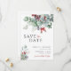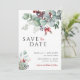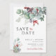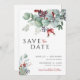 Um cartão de data com bonito cor d'água, gráficos folhagem invernal em tons vermelhos e verdes e uma fonte moderna. Estes cartões de na moda são a forma perfeita de deixar a família e os amigos saberem a data do seu casamento. Par com qualquer coisa na coleção NOELLE para um olhar coeso.