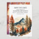 Cartão de guardar data de casamento de montanha e aventura com cores de outono e laranja queimada. Personalizado com sua foto no verso. Compre cópias impressas ou encomende digital para compartilhar com amigos e familiares por e-mail ou nas redes sociais.