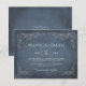 Um elegante convite para salvar a data com um fundo de quadro-negro azul-ardósia empoeirado emoldurado por uma delicada videira e uma borda de cacho de uvas — ideal para casamentos em adega, vinhedo ou região vinícola. A tipografia mista refinada em prata-branco suave completa o visual sofisticado. Todos os nomes, data, local e detalhes do site são totalmente personalizáveis.