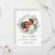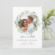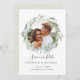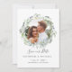 A Elegante botânica salva as datas apresenta uma foto de noivado favorita cercada por uma coroa redonda de oliveiras e folhas em uma elegante paleta de aquarelas e personalização verde com seus nomes, data de casamento e local.