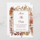 Um lindo design floral de outono em aquarela em tons de pêssego, branco, rosa, ferrugem e marrom. Adicione seus nomes e data e local de casamento, todos os campos podem ser editados.