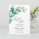 Informe seus amigos e entes queridos de sua data de casamento futura com esta elegante data de salvamento que apresenta folhas verdes de eucalipto com aquarela e uma imagem do casal feliz no verso.