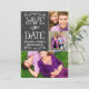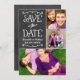Caprichoso e exclusivo cartão de anúncio de colagem de fotos de dois lados save the dates apresenta um visual texturizado rústico fundo de quadro-negro com fontes de estilo manuscrito que têm uma aparência de giz branco. Personalize com os detalhes do casamento e três (3) fotos de engajamento favoritas.
