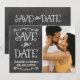 Anúncios de casamento e cartões de aviso com design único e rústico, com fundo de quadro-negro e fontes manuscritas que imitam giz branco. Personalize com os detalhes do casamento e uma foto de noivado em formato retrato.