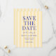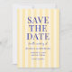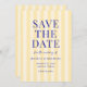 Crie o seu casamento personalizado, salve os cartões de data com tipografia moderna em cor azul no padrão listrado amarelo.