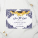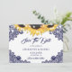 Casamento elegante de marinho rústico azul e girassol, exceto o cartão com flores de girassol e rendas florais azuis marinhos. Corações buracos nas costas. Itens correspondentes disponíveis para complementar este romântico casamento azul de marinho rústico salve o cartão de data.