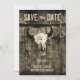 Crânio de vaca do boi russo ocidental com chifres, estilo vintage, salvar o cartão plano do anúncio da data. Textura de madeira de grunge rancho. Cowboy inspirou design. Fotografia de Marg Seregelyi, direitos autorais da imagem.