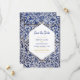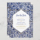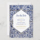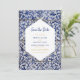 Este design apresenta padrões azulejos portugueses russos. O texto do casamento é elegantemente enquadrado com uma forma geométrica branca e dourada. Casamento floral único Azulejo azul e branco salve o design do cartão de data com elementos modernos. Os convites de casamento e outros artigos de papelaria também estão disponíveis.