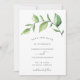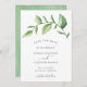 Rustic salve o cartão de data com um simples design com uma aquarela verde pintada com folhas grandes, sobre um fundo branco. Abaixo estão seus detalhes em uma cinza macia e a parte traseira tem uma lavagem de aquarela verde-clara. Um elegante design botânico que é excelente para uma celebração no verão.