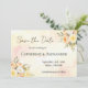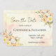 Anuncie seu dia especial em estilo com este elegante floral de aquarela salve o cartão de data. Apresentando lavagens de aquarela pastel macia e pêssego e florais amarelos, este design romântico dá o tom perfeito para sua próxima celebração de casamento. Clique em 'Personalizar' para exibir seus nomes, data do casamento e local. Ideal para chic rústico, estilo country ou casamentos botânicos.