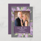 Este casamento para salvar o cartão de data é simples, rústico, elegante e bonito. Ela mostra sua foto em um quadro branco cercado por um bando de flores lilás pintadas manualmente em uma cinza e fundo roxo empoeirado. O título diz: Salve a Data na caligrafia de script lacy com espaço para os nomes do casal, a data e o local. A parte traseira tem um pequeno buquê amarrado com um arco branco. Uma maneira maravilhosa de deixar seus amigos e família saberem sobre seu próximo casamento.