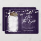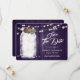 Casamento roxo russo salve o cartão de data apresentando um jarro de pedras e corações de burlap contra um fundo de madeira de celeiro adornado com luzes de cordas. Personalize facilmente este romântico casamento roxo e romântico, salve a data online. Itens correspondentes disponíveis para complementar este casamento roxo, salve a data.